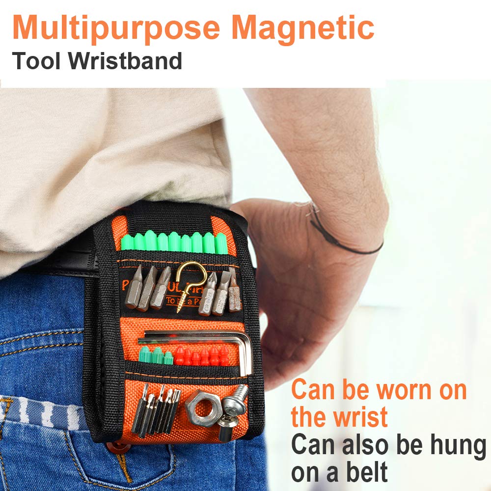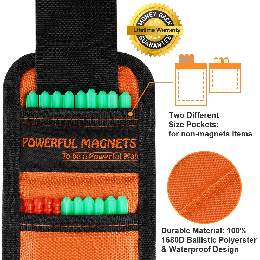 - Tow Pockets Design for Non-Magnetic Items: Magnetic nail holder designed with two different size pockets - great helpers for non-metallic items. You no needs to put nails in your mouth or go up and down searching for the toolbox. The magnetic force of this magnetic belt will much more than you can imagine, things feel way more organized and convenient. Whether you're a professional contractor or a keen DIY enthusiast, a magnetic tool wristband could be an essential addition to your toolbox!