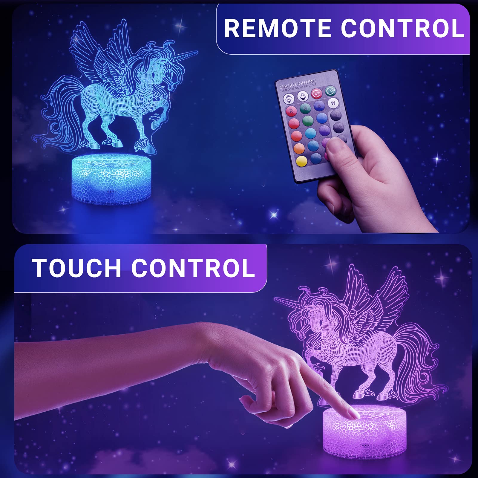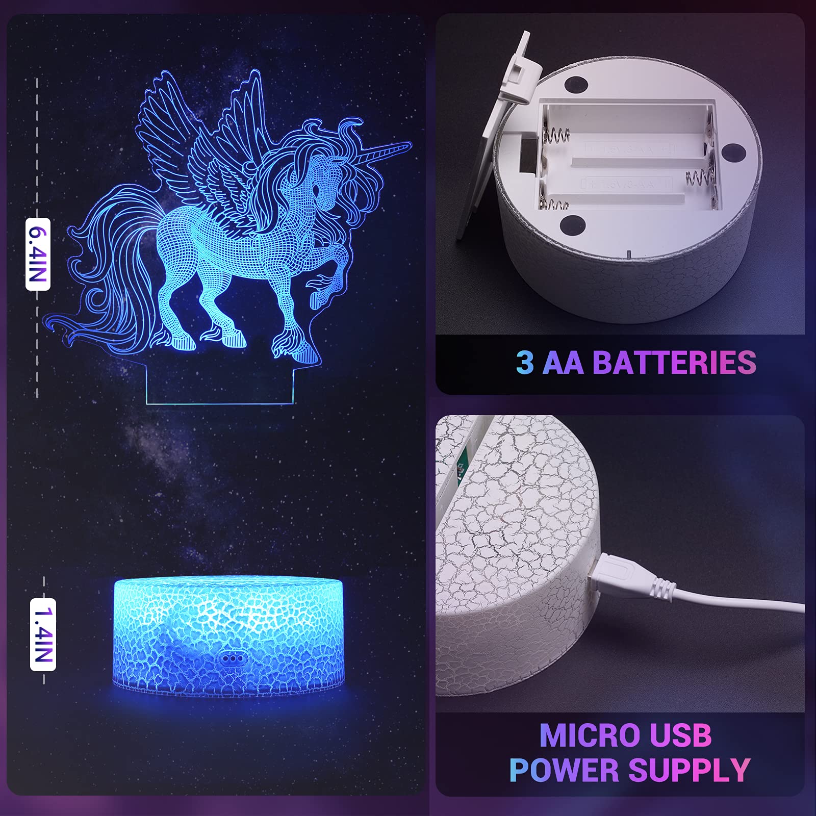 - [Dual Power Supply Mode]: The unicorn toy gift can be powered by 3-AA battery (not included) or 5V USB cord (included USB cord, no adapter), which is easier for kids to choose any power supply way as you like. Unicorn 3d night light gift can be fascinating to place at your side table. Unicorn light is a great creative light for girls' bedrooms, living room, Christmas, and birthday decorations. These gifts for kids are also suitable for new mommy as a nursery light.