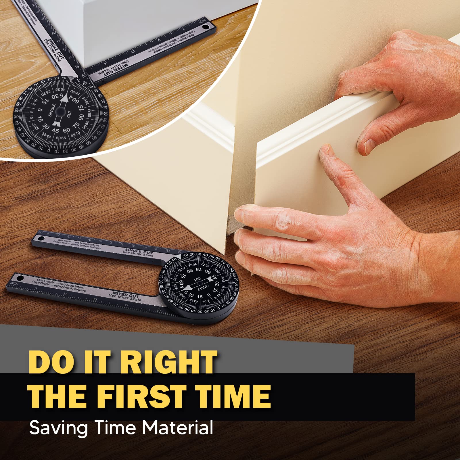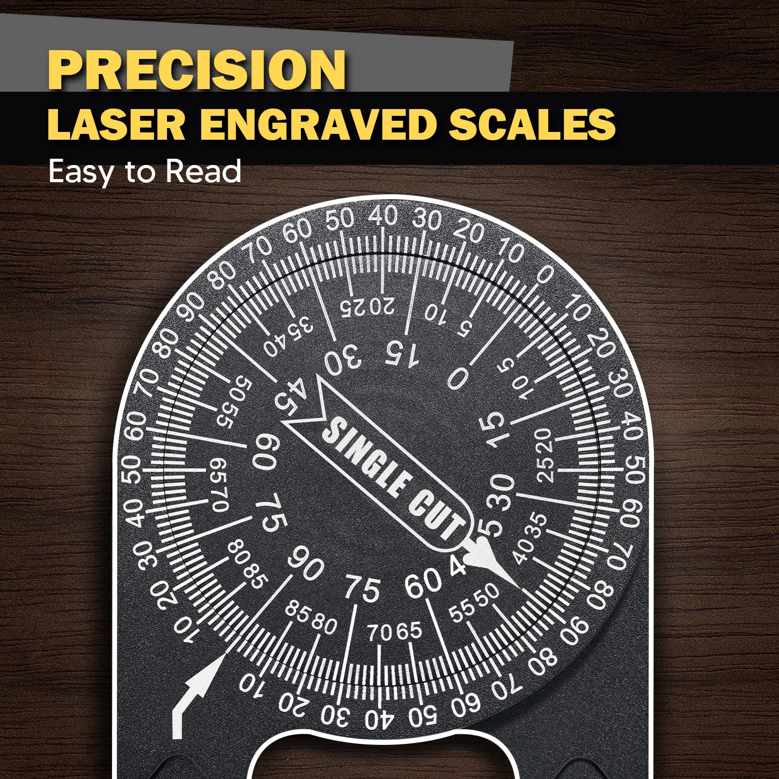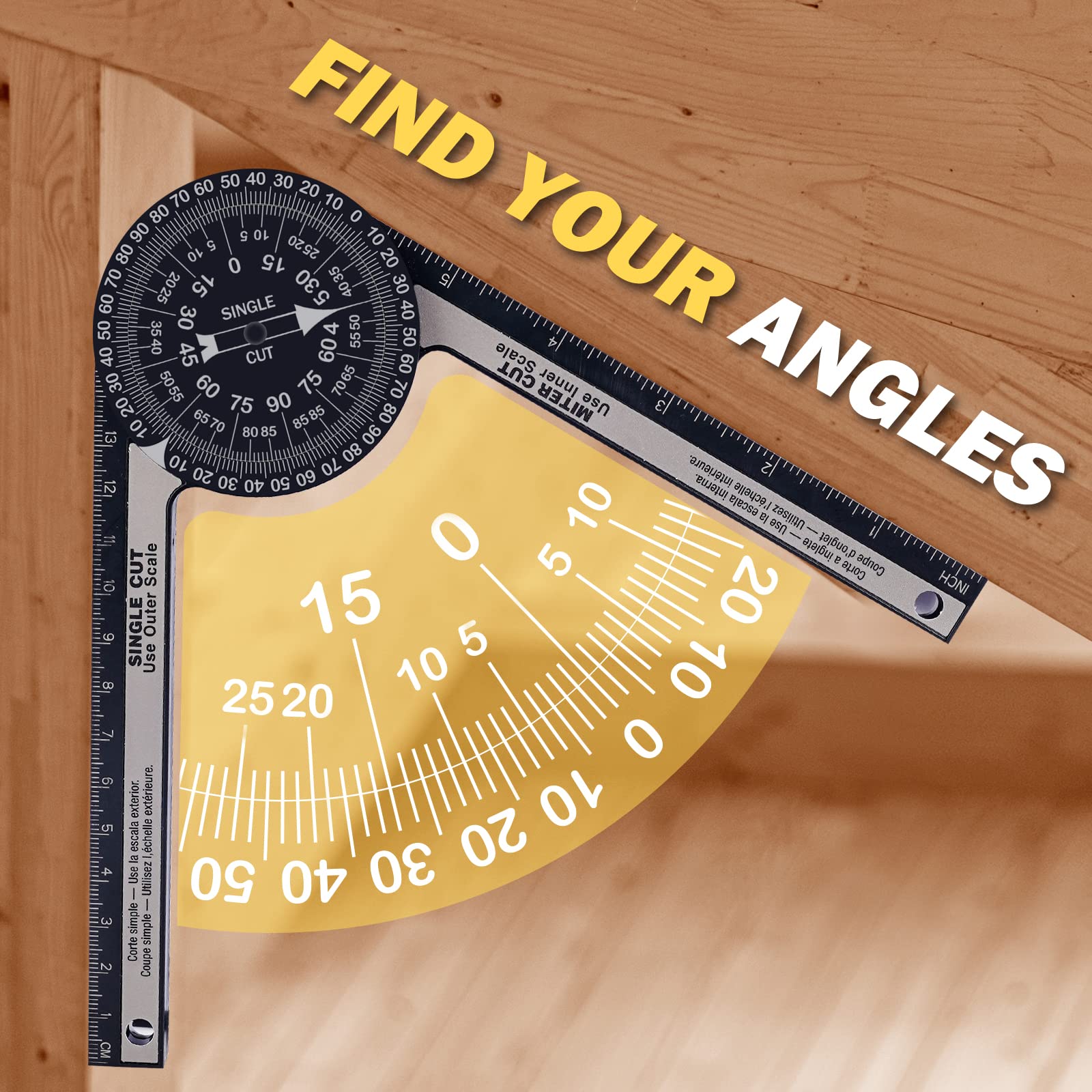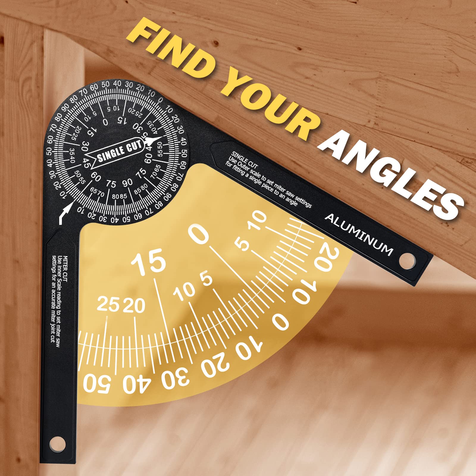 - Simple Protractor Achieve Great Measuring Jobs: Its two scales (miter cut&single cut) can directly transfer your wanted angle to the meter saw. Use the outer scale for taking single cut measurements and the inner scale for miter cut measurements. Miter protractor eliminates calculations, reduces errors, and provides greater accuracy for miter cuts. Whether it’s a inside or outside corner, basic crosscut or bevel/compound cut, this angle measuring tool can help you achieve a clean, precise cut.