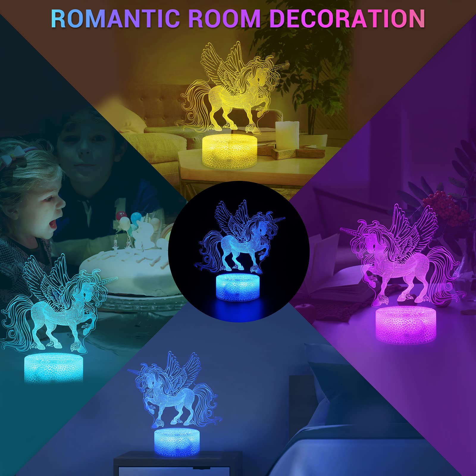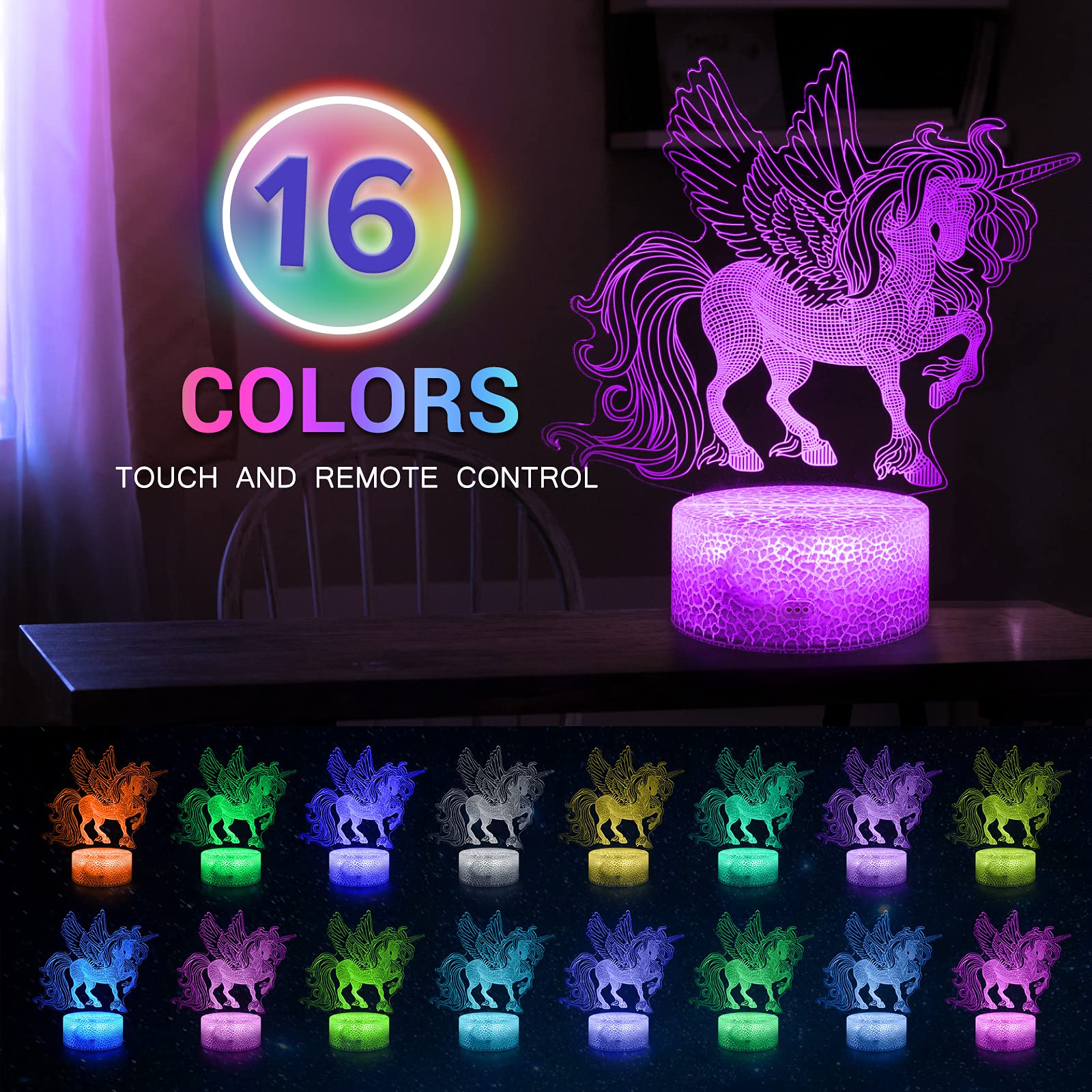 - [Fantastic 3D Unicorn Night Light Decoration]3D unicorn lights have 16 colors, are the perfect unicorn bedroom decor for girls. Unicorn light's power cord is able to be plugged into an adapter so it can even plug into a laptop or computer to power the light. Unicorn night lights come with technology&environmentally friendly LED, the important is friendly for the eyes. And the 3D unicorn lamp is safe, does not get hot at all even keep it on for a whole nightstand.