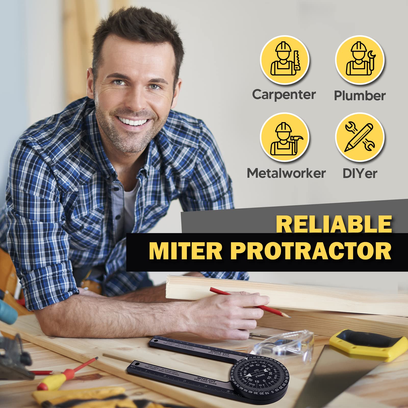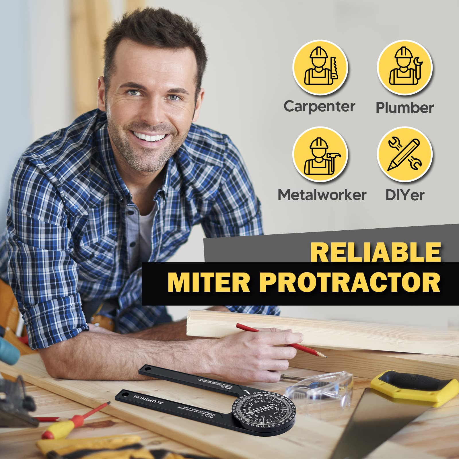 - Accurate Angle Measurement Tool: The precision CNC-machined aluminum alloy body combines with the laser-engraved easy-to-read scales for maximum durability and accuracy during operation. Our professional miter protractor can be adjusted to fit 0-360° angles, making it versatile and useful for any angle measuring task. Gives you the exact degree of angle to set your miter saw for a perfect fit! Its 1.96 inch thick aluminum alloy is more robust and won’t bend like the plastic ones.