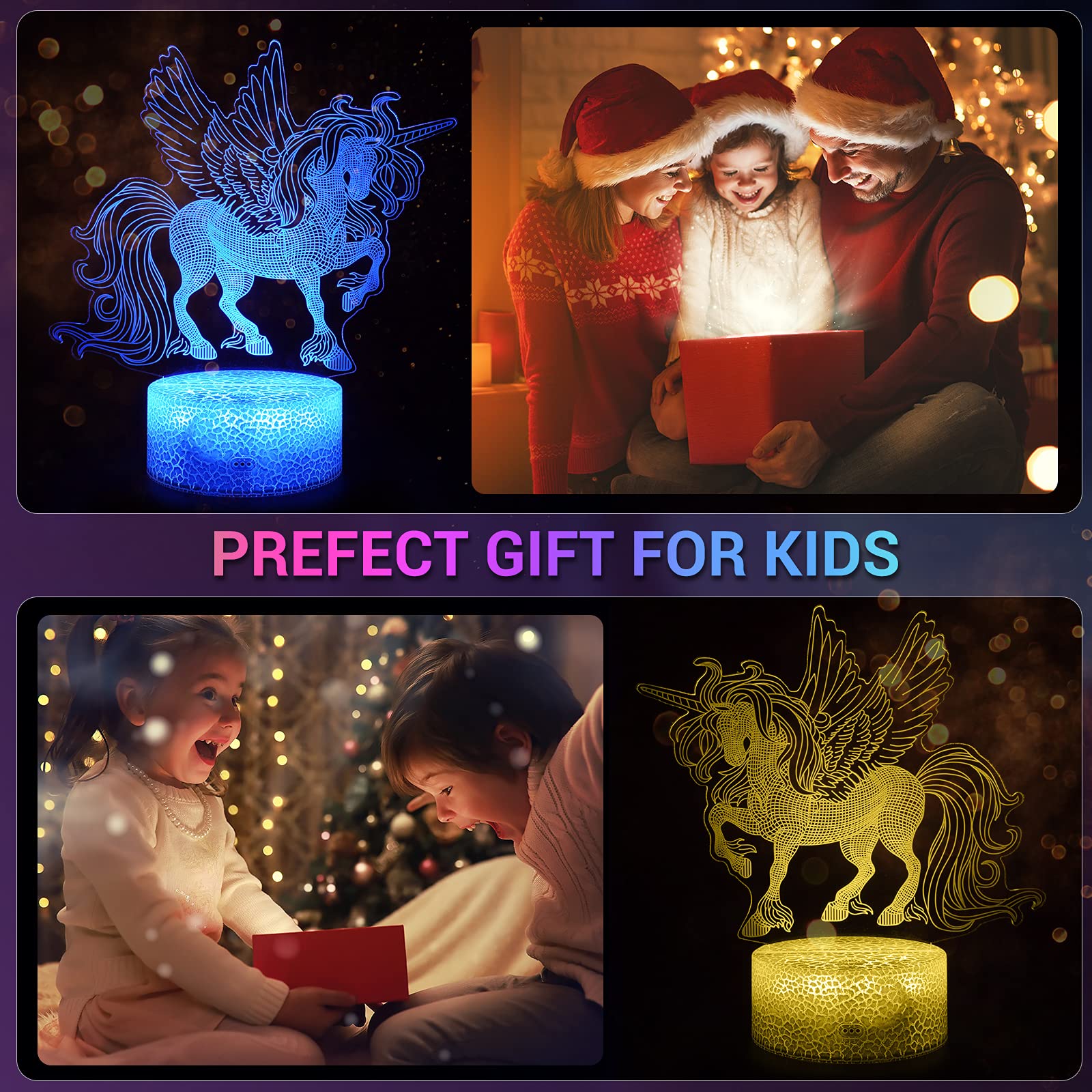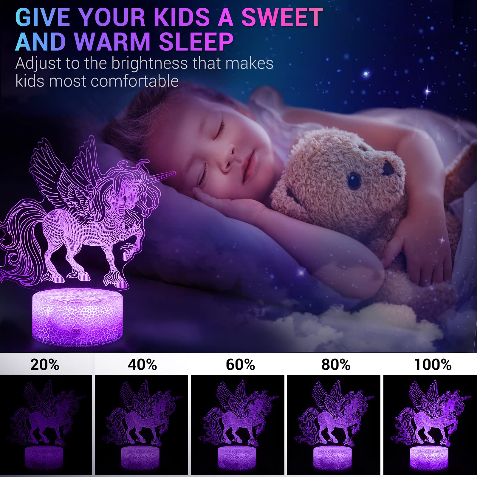 - [Perfect Unicorn Night Light Toys Gifts for Kids]: Unicorn light is sure to be one of your child’s favorite gifts. It's a great gift idea for 2~10 year old girls' toys. Kids will be happy for getting these beautiful unicorn birthday gifts. They will look forward to going to sleep at night when they know they will get to enjoy the coolest unicorn lamp they have ever seen. Every boys and girls need a unicorn lamps night light as a gift!