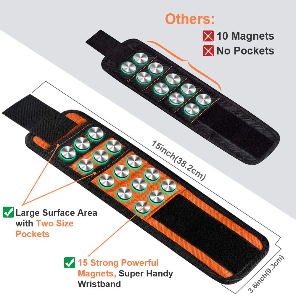 - 15 Upgraded Stronger Magnets - Gadgets Never Come Off: Magnet wristbands embedded with 15 strong NdFeB magnets. Powerful magnetic wristband for screws nails, screwdriver bits, magnetic drill bits, nuts, washers, and bolts, etc. Finally, work can be done quickly and easily whether in a small space or on a ladder or roof. SOOFUN tools for men magnetic wristband can save your time climbing ladders searching for tools. Perfect magnetic wrist tool holder to free up your hands and speed up your work.